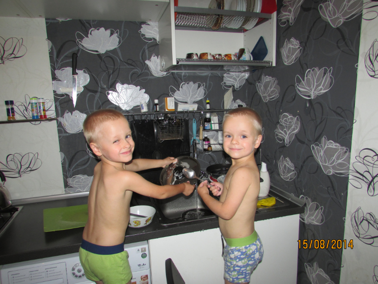 А еще мои котики научились мыт посудку.