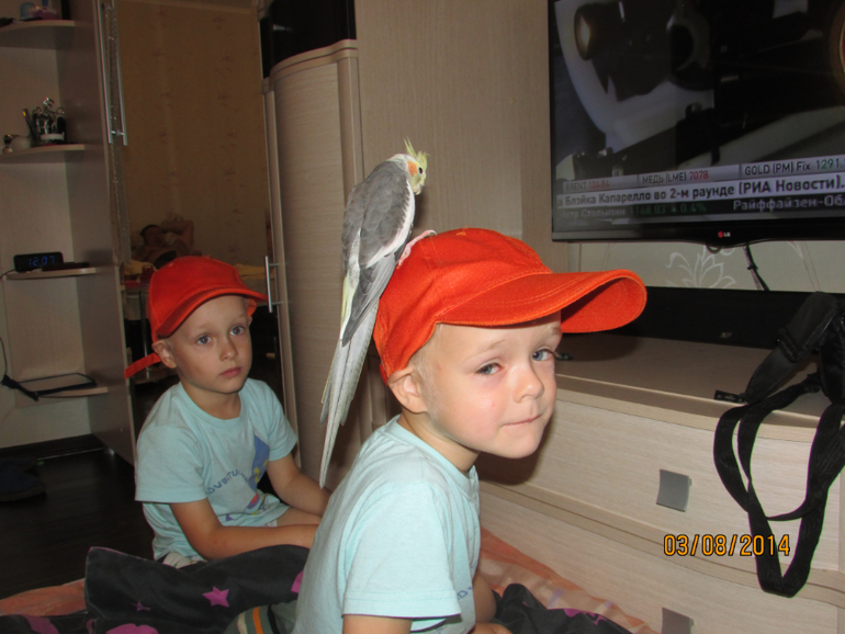 Детки по началу очень боялись попугайчика Кешу, даже в доме находились в кепках, мало ли сядет. И вот Кеша сел, и Дрюнич в ужасе.