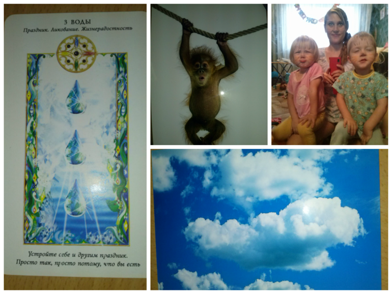 7. Были мы тигрятками, идея пришла спонтанно! Придя с универа было замечательное настроение. Люблю именно психологию со всякими тренингами и заданиями, и вот результат. Задание было таким вытащить первую фотографии не видя всех и описать свое состояние, т. е сравнить ее со своим состояние, вторую фотографию выбирали сами так же по своему состоянию, а в этот момент с моим подвешенным здоровьем мне хотелось отдыха, красивого неба над головой!!! А третью карту мы выбирали не видя их и эта карта должна была объединить всё вместе! И вот он ответ УСТРОЙТЕ СЕБЕ И ДРУГИМ ПРАЗДНИК. Поэтому по дороге я вооружилась грим - карандашами, мыльными пузырями, и дома надули шарики и был у нас праздник, потому что для них уже праздник что я пришла!!!!!