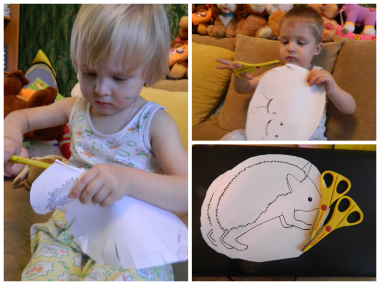 6. Работу с ножницами мы делали впервые, стала замечать что хочется им все попробовать порезать. Макар сразу начал резать, а Варя не сразу поняла как их держать, но потом вошла в суть дела. Задание состояло в том чтобы сделать ежику иголки, но в итоге от ежика ничего не осталось)))