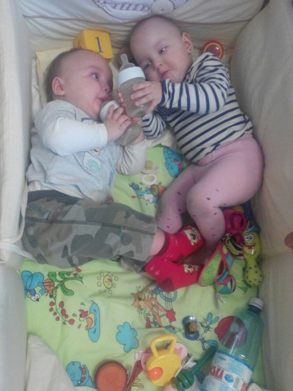 играли в кроватке,бесились,говорили,смеялись друг с другом...и тут тишина))) я бегу смотреть,а там картина: звяли в конце кроватки компот,улеглись и пют