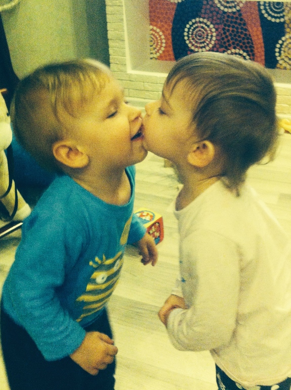 Диана воспитывает иргушечную кису. Везде ее с собой носит. В одной ручке киса, в другой детская ложечка, которой она кису кормит периодически. Диана кису любит, гладит, целует. Целует всех кисой. Сегодня даже диван по периметру ей расцеловала. Сама она тоже очень любит целоваться - девочка. Короче дети пока в нас с мужем оооочень влюбленные. И всячески это проявляют. А мы их любим всегда и навсегда)