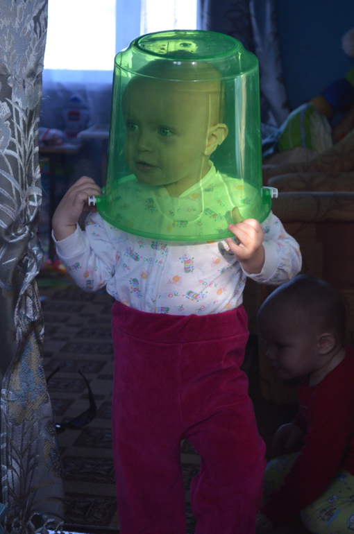 Одевают на себя маленькие ведерки,естественно на голову и бегают с ними,все бы ничего,но одно из ведерок черное,естественно врезаются во все что попадается,а попадаюсь в основном я,сестра и холодильник))))