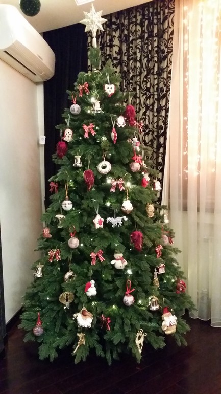 У меня в голове было немного другое представление о том какой я хочу видеть нашу первую елочку, тем не менее я довольна результатом. Все игрушки я покупала через интернет, т.е. не видя вживую, но мне повезло, и за исключение двух - все игрушки не только соответствовали моим ожиданиям, а некоторые даже превзошли.