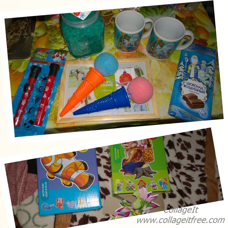 В общем, если всё не перечислю, то простите меня, пожалуйста. Там оказался и развивающий конструктор, и пазлы, и фонарики с новогодней тематикой, калейдоскопы, сладостей огромное количество, какие-то забавные игрушки, две кружечки с новогодней тематикой, их всегда не хватает :), родителям много-много всего, одна соль для ванны с удивительным запахом чего стоит, и фоторамка тоже очень нужная вещь :), а также много сладостей для взрослых и сухофрукты :) Ах, да не обошлось и без новогодних книг, это отличный подарок :)))