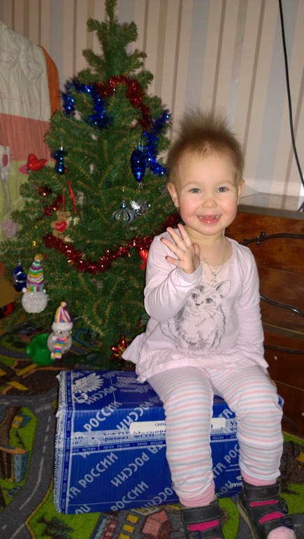 А теперь вернёмся к нашему чуду. Забрала я на почте посылку очень быстро и очень успешно :) Пришла, а мои уже проснулись и я им посылку сразу и подарила, сказав, что дед Мороз и Снегурочка им передали. Мы с ней фотографировались и сразу дети потребовали открыть - открыла и не смогла остановить разграбления её :))) всё сразу стали доставать и быстрее быстрее тестировать :))) На фото ёлка на заднем плане наряжалась детьми вчера, так что образец пока не доделанный :)))