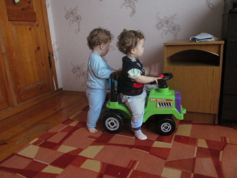 Мальчишки очень хорошо играют вместе: в прятки (прячутся за шторкой друг от друга), в догонялки (в основном Ромка догоняет Тёмика и забарывает его,а тот убегает и хохочет), игрушки делят постоянно. В общем - ВЕСЕЛО НАМ ЖИВЁТСЯ