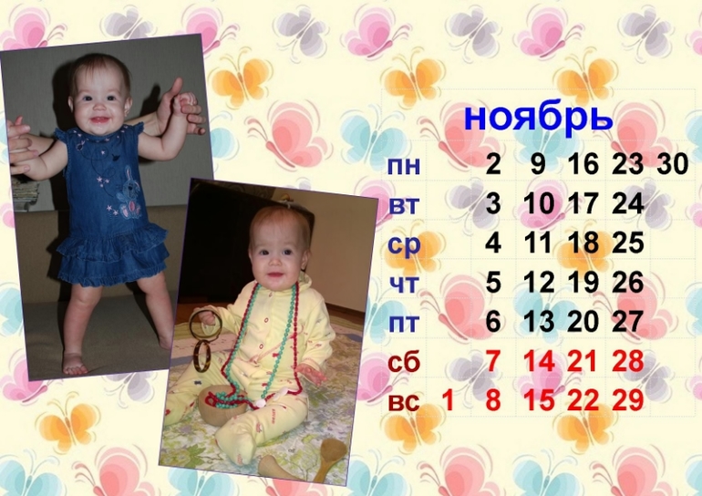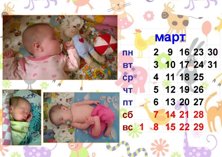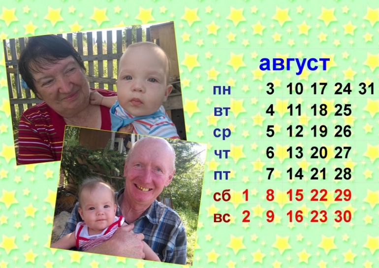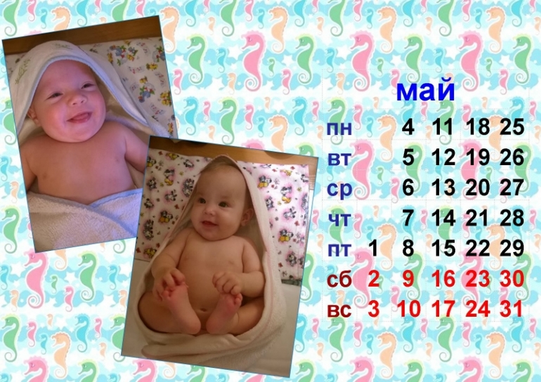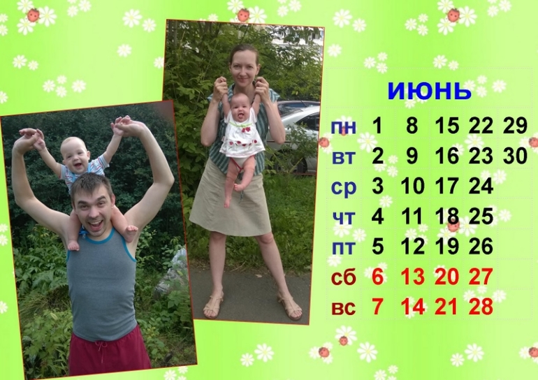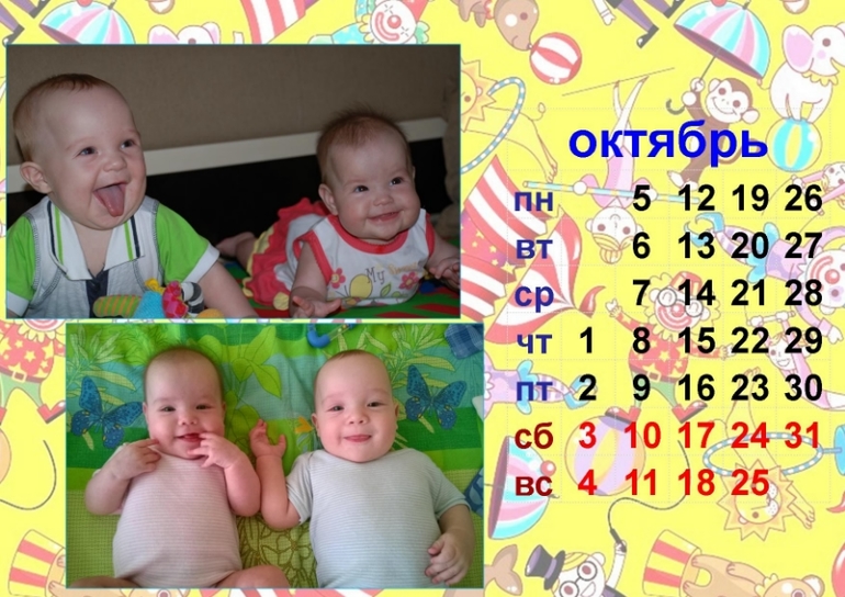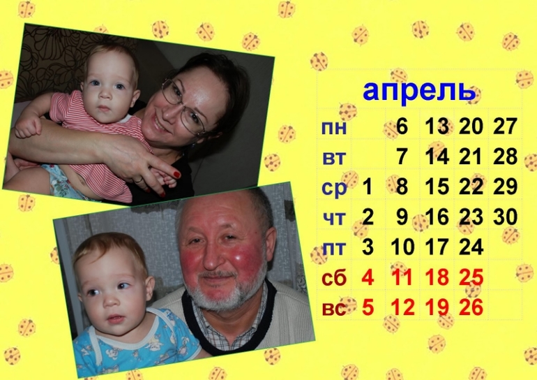Позитив =)Вот такой календарь соорудила я в подарок бабушкам-дедушкам. Основная идея была - собрать фотографии детей, но и сами бабушки, дедушки и мы с мужем тоже немного есть. Делала все с нуля: фоны подбирала сама, сетку с датами вставляла сама, ну и самое непростое - подборка фотографий. Фотографий море! Выбрать из них десяток-другой - совсем непростое дело. А еще объединить их в одну тему и разместить по месяцам. В общем, смотрите сами, что получилось. Может, кто-нибудь вдохновится и решится сам попробовать :)