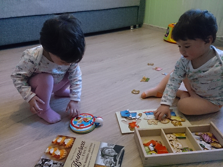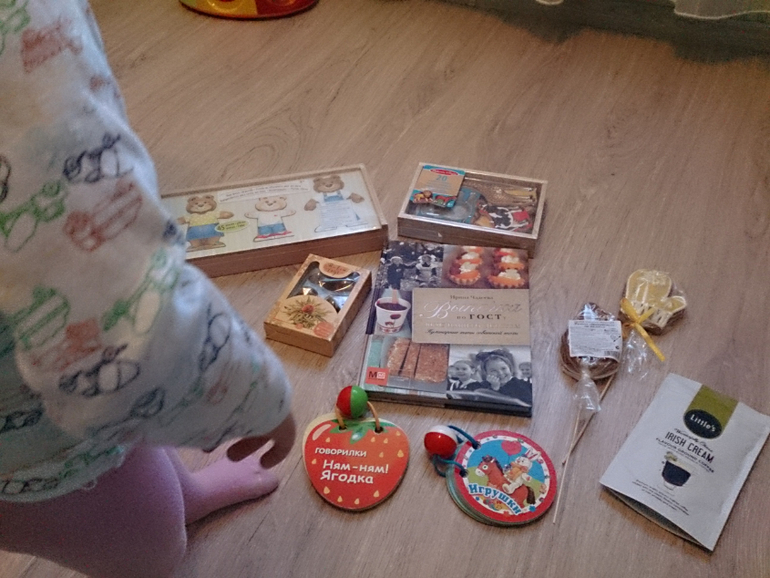 Спасибо тебе,наш Двойняшковый Дед Мороз! За отличные подарки и хорошее настроение! Девочки получили суперский деревянный пазл Наряди семью медвежат и деревянные магниты животных, все от Мелисса энд Доуг, плюс веселые,красочные книжечки. Мы кофе Латте(м-м-м обожаю Латте), чай заварной,вязаный,распускающийся,цветочный(вкуснятина), пряники на палочках(как в детстве Тульские),и лично мне книгу рецептов Выпечка Вкус нашего детства.
