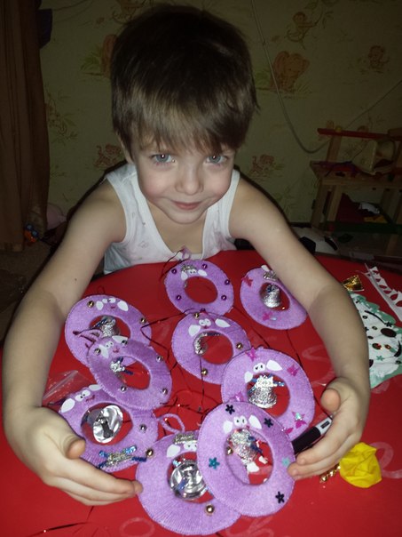 Заготовки кружки обмотанные нитками с колокольчиком у нас остались после старого года.Их делала я в прошлом году.Но захотелось обновить так сказать декор комнаты,поэтому решили сделать овечек.