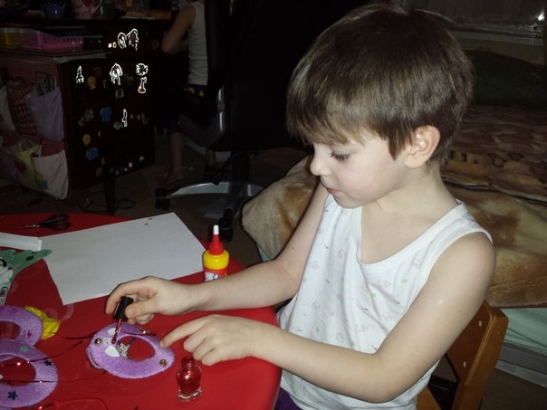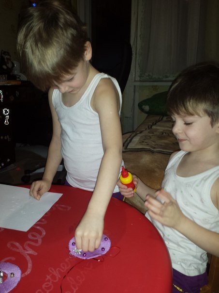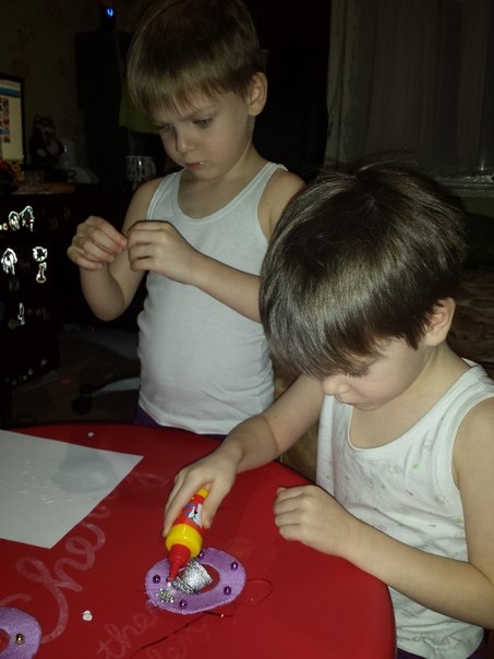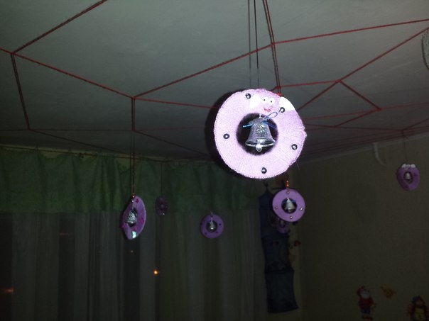 Вырезали из бумаги глазки,ушки и приклеивали их клеем.Рисовали зрачки и ротики.И все......теперь они висят ,звинят и радуют глаз))))
