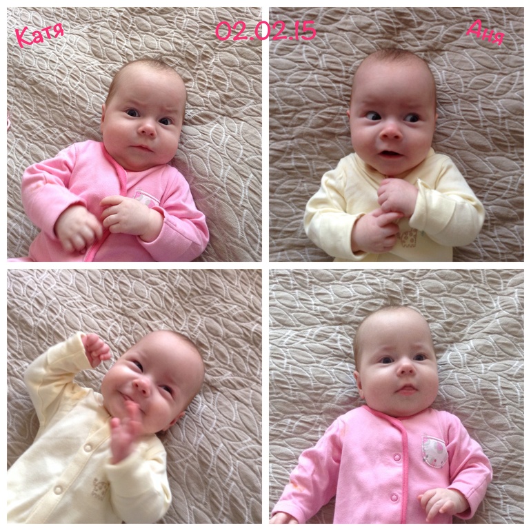 Девочки постоянно крутятся с боку на бок, на живот почти получается, при этом верещааат :) Хватают погремушки, перекладывают из одной руки в другую.
