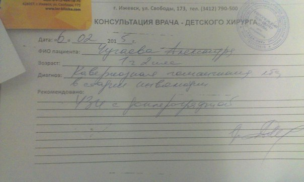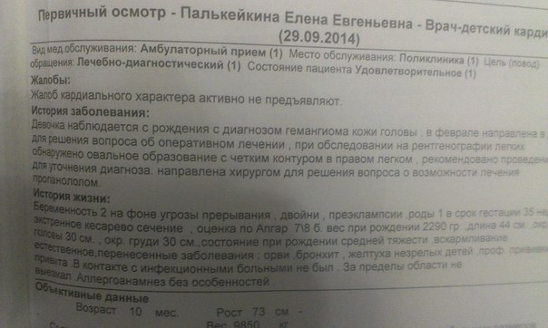 Привет, Юля!Отправляя вам посылку с сарафанами и подумать не могла, что вас так же как и нас коснулась гемангиома.Мы свою лечили Пропранололом в Москве, под присмотром кардиологов. Результаты шикарнейшие. Главное, во время пересчитывать дозировку и проходить диагностику общего состояния. Порошки мы пили почти 1 год. С ужасом вспоминаю жизнь по будильнику. Препарат надо было давать чётко каждые 6, а потом 8 часов. Особенно ночью вставать и будить младенца...Сейчас мы здоровы, осталась только небольшая сосудистая сеточка, скоро поедем отчитываться перед врачом. Прошёл год, как мы закончили своё лечение. Вновь ничего не разрастается. По холтеру тоже всё ОК.Может и вам не нужна операция? Желаю скорейшего выздоровления ;-)