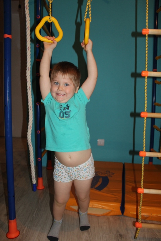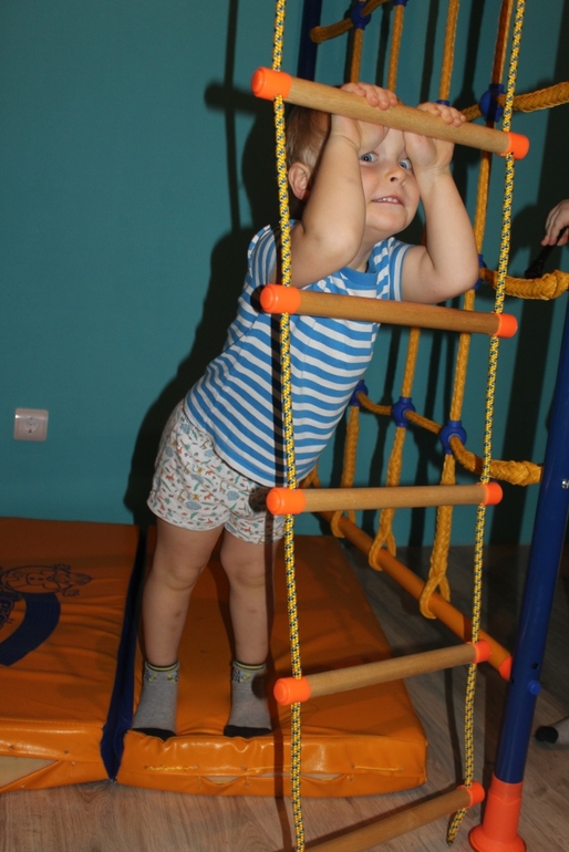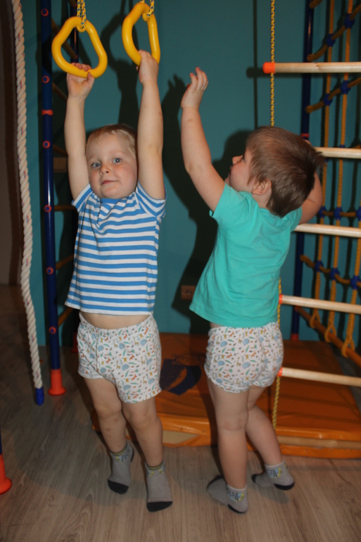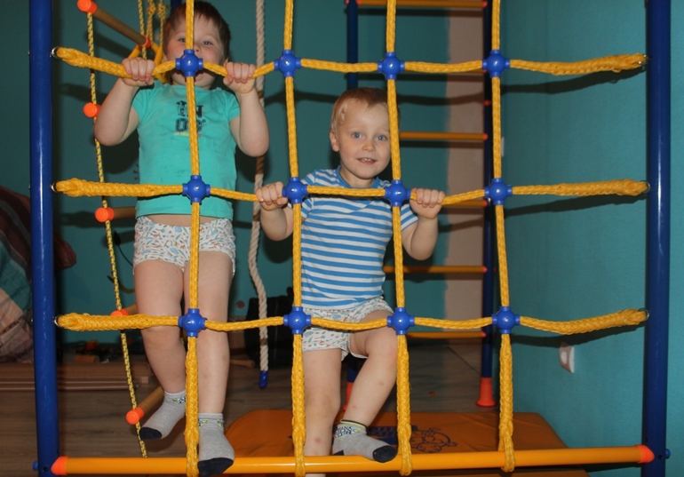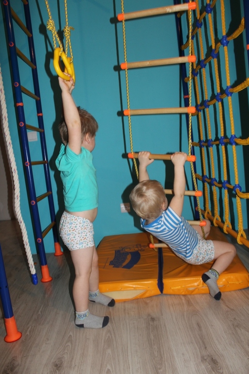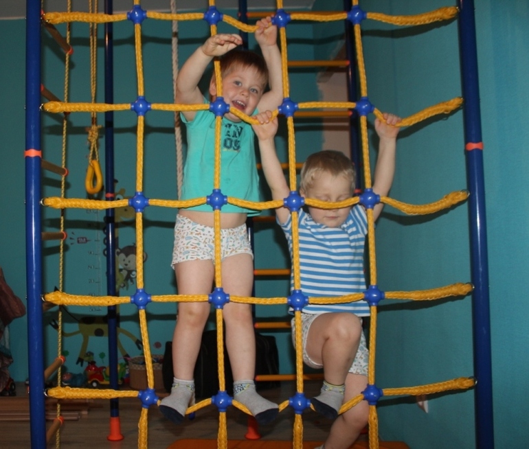Сначала мальчишки катались на кольцах, осваивали канат. Залазили на шведскую стенку, сетку для лазания, лестницу, невысоко, так как побаивались. Просили, мам поддержи, мам снимай меня, мам держи меня. Так было где-то дня три. Затем интерес пропал, я даже расстроилась. Но чуть погодя, мальчишки так стали заниматься, залазить так высоко, что теперь стала бояться я))) Теперь это одно из любимых занятий мальчишек! Далее немного фото