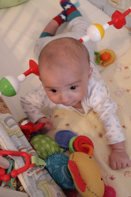 Начал переворачиваться, правда получается у него это как-то через раз. Если ему неохота, то так и останется на боку лежать. А при желании и перевернется, и на пару сантиметров сдвинется вперед. Малыш вдумчивый, сначала все изучит, потрогает аккуратно, решит, что ему точно надо, а только потом в рот потащит. Начал наконец-то нормально гулить. Рассуждает о чем-то своем))) Ездили с ним к остеопату, проходим очередной курс массажа. В-общем, замучили дитёнка