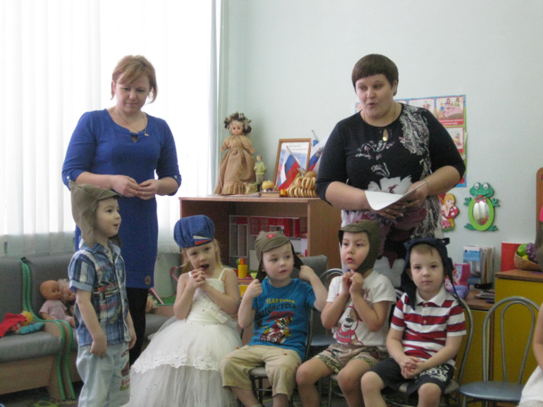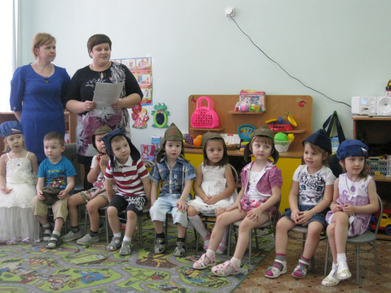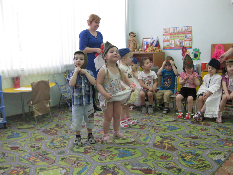 Каждому ребенку выдали по шапке-кому пилотку,кому буденовку!