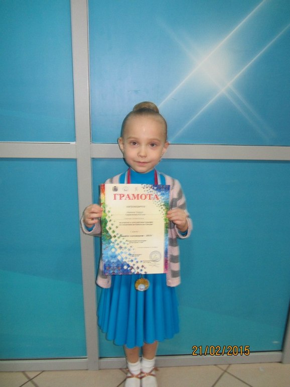 С сентября прошлого года ходим на занятия по спортивным бальным танцам. Где-то с ноября уже танцует в паре с партнером (Захар). Уже два раза были на соревнованиях. В декабре заняли 2 место, а на прошлой неделе - 1 место! Выдали по медали и грамоте.Юля очень хотела занять первое место и была безумно рада, что вторые соревнования принесли желаемый результат)Это второе место!