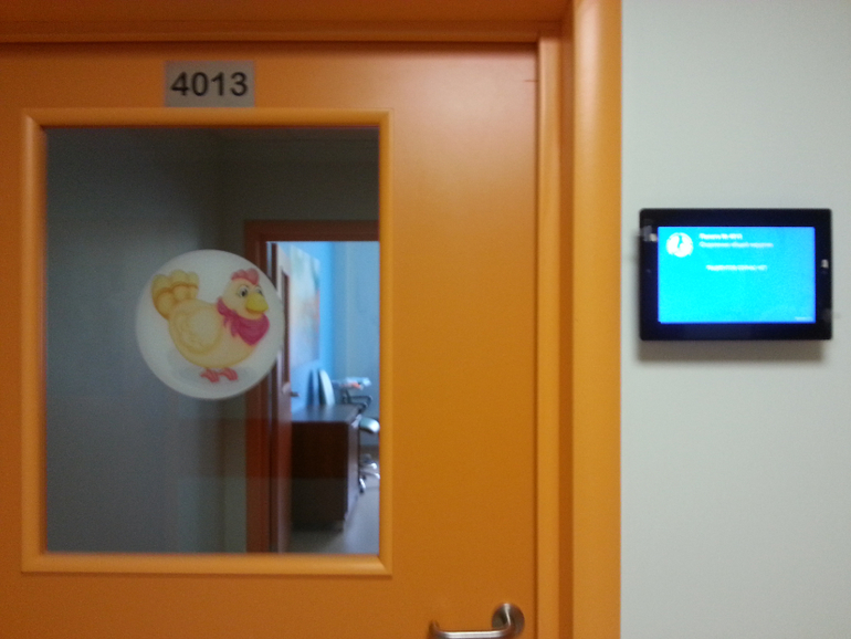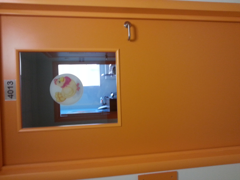 Все этажи выполнены в своей цветовой гамме: наш - в оранжевой, третий в зеленой и т.д. Для удобства ориентирования детей: сегодня ехала в лифте с ребятами, лет по 10, они по большей части ориентировались где им выходить по цвету этажа. На дверях палат изображения животных- тоже для детей: им проще запомнить, что он из палаты с курочкой или бабочкой, чем номер 4013 ☺