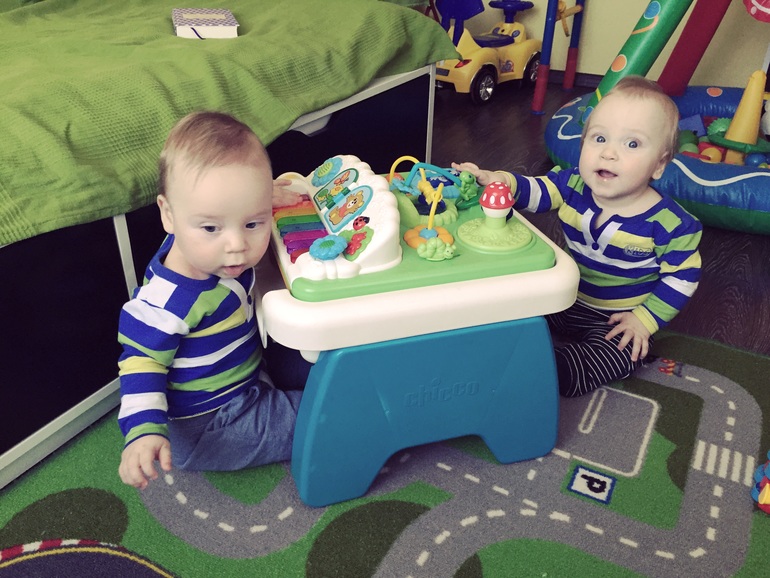 Любо-дорого смотреть, такие милахи!!!!про крещение в реанимации читала со слезами на глазах, теперь такие крепыши тьфу-тьфу, игрушек столько много классных, хорошо что все трое мальчишки, коляска, тоже считаю, самая подходящая для двойняшек! сколько знаю близнецов вот всегда так один шустрый, а другой вменяемый))))