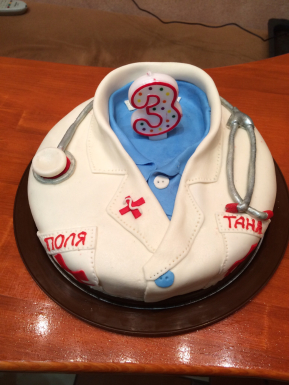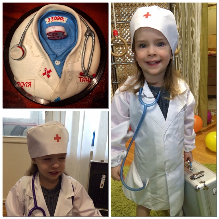 Как здорово придумали, даже торт в тему! Девочки красавицы! Кого лечат — игрушки или маму с папой? :))