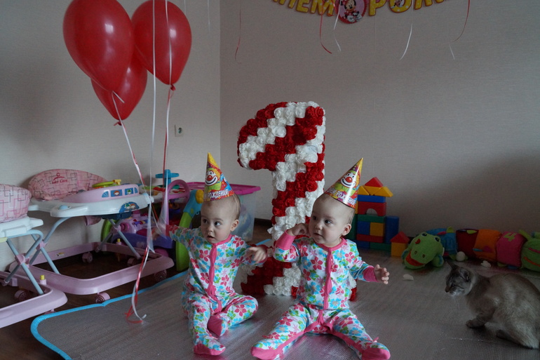Двойняшки до 1 годаДевочки привет! Читаю вас давно, но написать решила только сейчас. Меня зовут Светлана и я мама трех девочек. Старшая Екатерина 14 ЛЕТ, двойняхи нам уже целый год!! О двойняшках я мечтала со школы. Сделав УЗИ в 5 недель и узнав неожиданную новость, я не смогла сдержать слез , как и многие из вас. Голова кружилась от мысли что я стану многодетной мамой. Беременность протекала хорошо. общая прибавка за Б 22 КГ. Сейчас мой вес уже 57, как и до Б. Девочки решили появиться на свет 20 марта 2014. ЕР за что отдельное спасибо врачам. И так первый ребенок 7/8 апгар 2770/50, второй ребенок 5/7 апгар 2580/48. на 7 день нас выписали домой чему я безумно была рада. Встречали родственники все было очень трогательно.