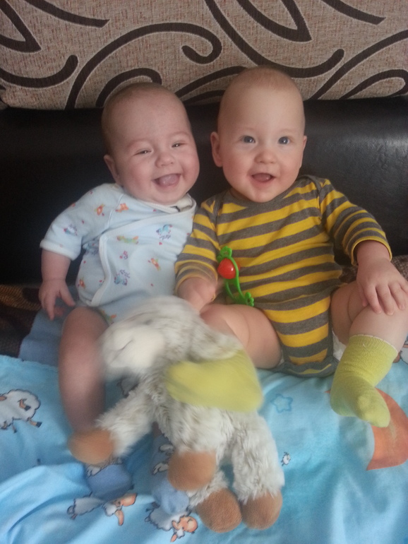 Вместе с детьми и для детейЗдравствуйте ББ. Меня зовут Вика и у меня два замечательных сына, вчера им исполнилось 8 месяцев!!!! Читаю вас с начала беремености, а написать все руки не доходят. Родились мы на 31/32 неделе. Первый Степа в 13.45 весом 1165 и 37 см.. Второй Арсений в 13.50 весом 1640 и 41 см, вот такие мы маленькие.долго лежали на дохпживании.Сегодня они уже 6360гр 64см и 7840 гр 70 см. Степа у нас улыбаха, Сеня ни минуты на месте ,шило в попе