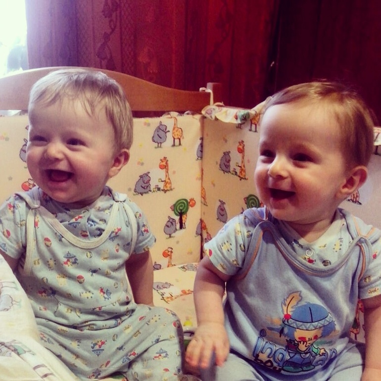 Двойняшки до 1 годаМы уже совсем большие.Очень многому научились за последний месяц. Мы сидим, встаем у опоры, ползаем. Зубы правда до сих пор ждем. Мальчишки меняются почти каждый день, каждый день что-то новое, новые навыки, новые эмоции, новые хулиганства))) И мне стало реально легче . Можно посадить их на пол с горой игрушек и они друг с другом с удовольствием играют, правда, периодически расползаясь по разным углам))) Весим примерно8800 и 8300, рост точный не знаю, взвешиваемся дома сами. А вот и мы: