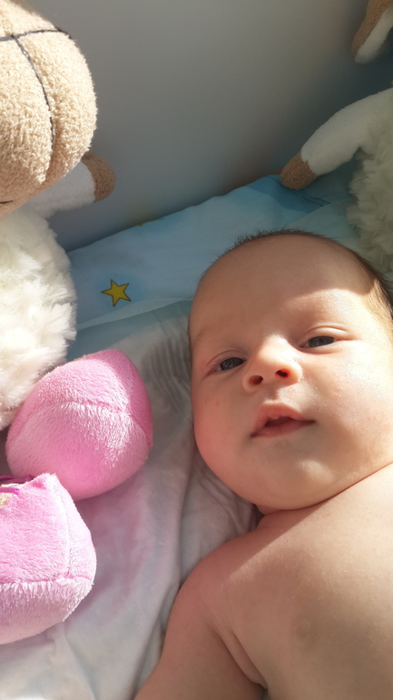 Дианка у нас такая девочка девочка)меньше брата на кг с лишним, такая скромняшка, гулит меньше намного, такое тоненькое Абууу, любит коврик тини лав, хватает солнышко на нем ручкой, и сморит смотрит...головку держит хуже, но старается. Колики у нее сильные были, но слава Богу пережили, тужится только по утрам бывает, никак раскакаться не может, но и это думаю скоро пройдет. Кстати мы на ГВ, на ночь смесь.