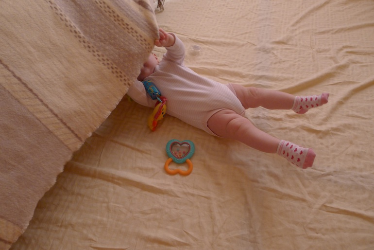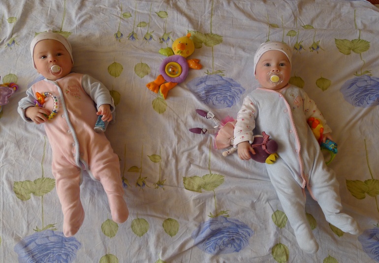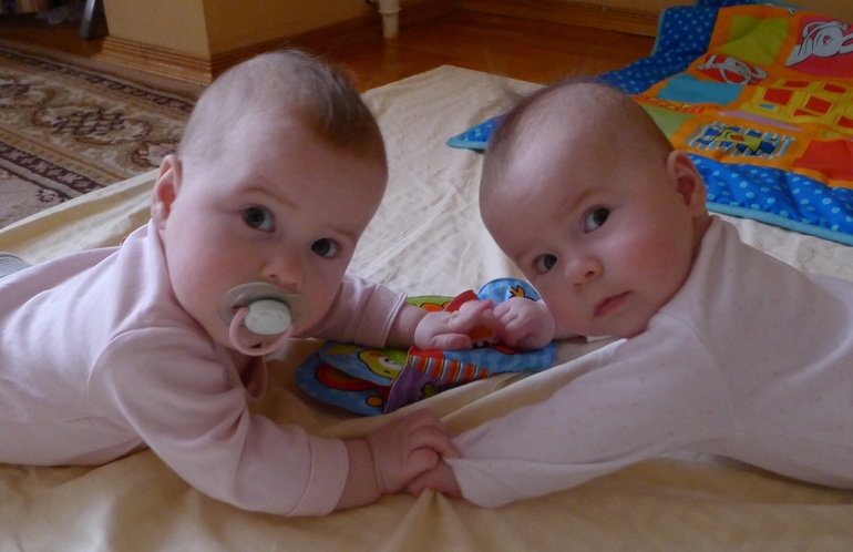 Девочки встают на четвереньки, ползают, но быстрее пока получается перекатываться. Очень нравится сидеть с поддержкой, сами еще не садятся.