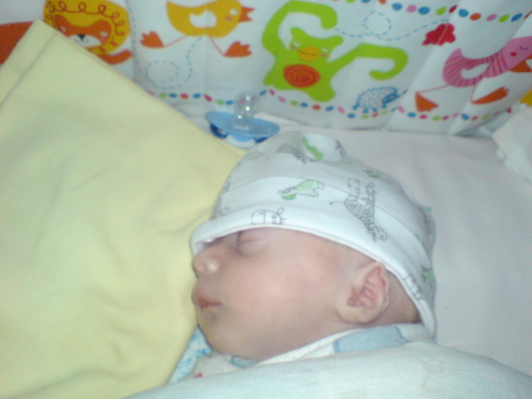 нам месяц и вот так без проблем мы помещаемся в кроватке)