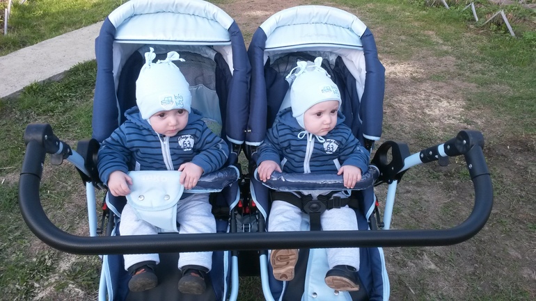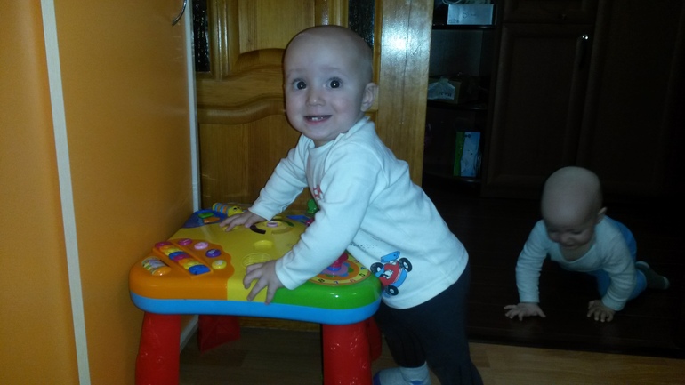 Двойняшки до 1 годаЗдравствуйте, ббшечки! Запоздала я в этот раз с отчетом. Но, как говорится, лучше поздно))) Мы сегодня были у педиатра. Взвесились и померились: Тема 9500 и 74, Никита 9000 и 73. Прививки мы пока не делали, после года начнем. Думаю, пентаксим. Режим у нас пока такой жк как и в прошлом месяце. Спим 2 раза днем на балконе, иногда выхожу на улицу. И тогда мы сначала гуляем-сидим и смотрим по сторонам, а потом спим час примерно. И опять немного гуляем. Просыпаемся утром по-разному в 6-7-8-9. И не всегда синхронно. Отбой в 21:30-22:00. Вот по кормлению у меня вопрос: мы едим утром в 9 часов кашу 150 где-то больше не хотят, через час где-то смесь 150-180, обед в 13-13:30 после утреннего сна 150 гр овощи с мясом. Потом опять смесь через час. В 4-5 творог и фруктовое пюре. В 7-8 вечера каша и печенька. На ночь смесь 240-260 мл и ночью еще бывает смесь 240 где-то. Я их не перекармливаю? Но кормлю смесью т к они сами хотят. Просят. Теперь про умелки- ну ходить самостоятельно еще никак. Тема замечательно стоит сам, не держится, может сделать шажок, но сразу трусит и на попу садится. Никита очень смел, но ноги еще не слушаются. Отрывается от опоры и бежать вперед с улыбкой и смехом, но падает, равновесие пока не держит. Тема у нас серьезный и рассудительный, спокойнее Ника. Он чужих не любит и на руки не пойдет. Никита смехотуньчик и улыбаньчик. Легко идет на контакт. Всегда улыбается и очень крикливый и эмоциональный. Любит ладушки, сороку ворону и песенки. Телефон только зазвонит у кого он в пляс сразу. Тема- скала. Эти танцульки ему до лампочки. Друг с другом играют немного, в основном отнимают игрушки, могут толкаться и по лицу шлепать друг друга. Уже проявляют ревность. Тема более самостоятельный, Никита ручной, мамин. Зубов по 4 пока. Как зимой вылезли так больше и нет новых. Очень любят папу и сестру - ее больше всех наверное. Фаворит, ей и делать ничего не надо, чтоб они смеялись и взрывались от эмоций! Ну что еще написать. Люблю своих малюток. Мне посчастливилось в жизни узнать, что такое 2 малыша одновременно, так интересно наблюдать за ними, сравнивать, видеть какие же они разные, личности. Все же детей разного возраста невозможно так сравнить. Девочки, какие мы с вами счастливицы!