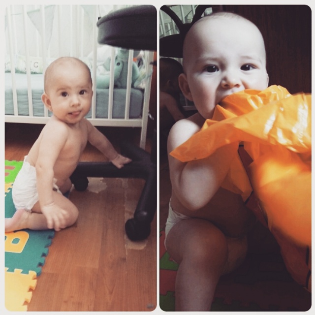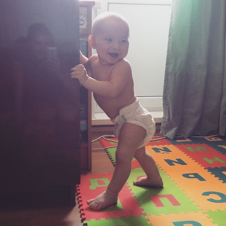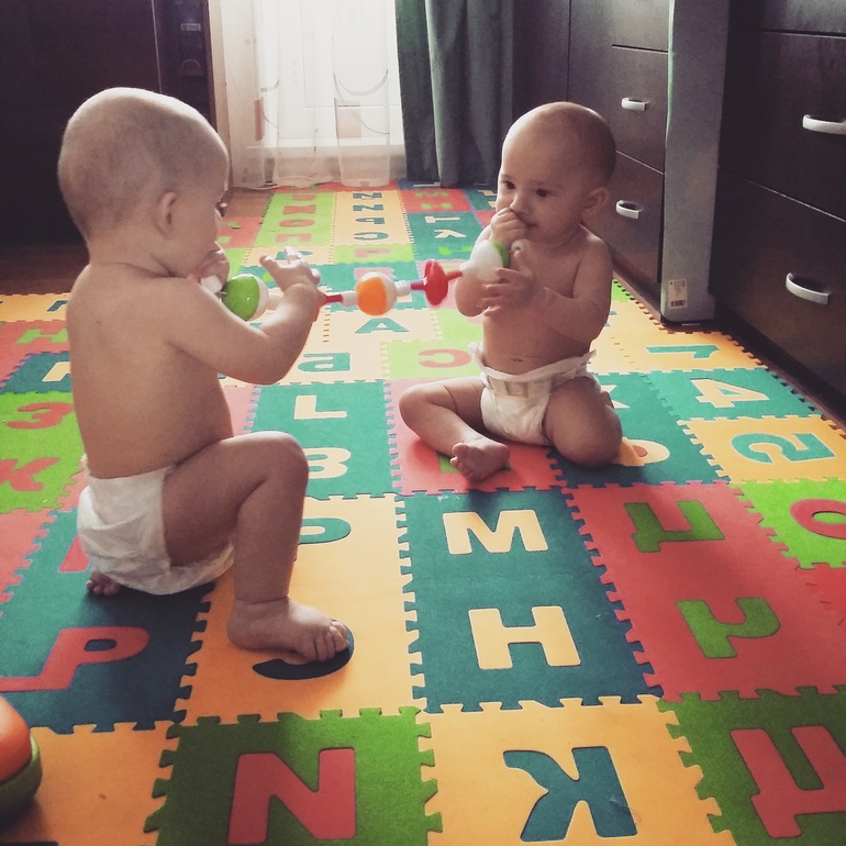 Ох. Ну все, это два человека которые быстро ползают-шлепают по всей квартире. Стоят у всех возможных опор. Главное, научились обратно плюхаться на попу. Все им надо..причем то тихо мирно сидят на пару в комнате, то с нытьем догоняют меня на кухне и в ванной. Пакеты, веревки и прочие предметы быта-это наше все)))) Игрушка- та что в руке брата. Соска, конечно, тоже во рту брата)))) Ромка, наконец-то стал робко болтать ай-ай-яй, мя-мя-мя и бу-бе-бя. Не очень четко, но я рада. У Левы хриплым брутальным голосом все тоже самое, но более уверенно и часто. Ладушки, указательные жесты и прочие интеллектуальные таланты пока не проявляются...ну подождем)))
