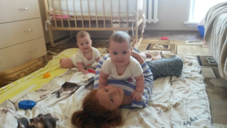 Итак, у старшей Анисы в 7,5 месяцев вылезли зубы, нижние резцы, один за другим, целых 2 штуки! Она, наконец, встала в 7 месяцев на четвереньки. Сейчас усиленно пытается ползти, но получается только пятиться.Ещё Аниса пытается сесть и вальяжно полёживает на боку, оперевшись на локоть.