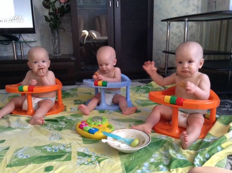 Какое чудо! Тройня- просто чудо! Молодцы девочки! А коляска у вас для тройпи или для двойни?