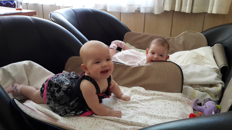 Мария 2700 и София 2600. Сейчас весим София 6800 Мария 7000 рост не меряла)))Девочки очень разные как внешне так и по характеру. София активная вот все ей надо все ей интересно переворачивается со спины на живот,держит игрушки пробует их сразу,пытается держать бутылочку но не всегда получается, подымается на ручки, пытается ползти носом упрется попу вверх подымает ну ни как не получается вперед но как рак пятится назад и крутится на животе. Мария более спокойная но очень любит поговорить о своем о наболевшем)))переворачиваемся со спины на живот можем спать на животе,держим игрушки, на ручки немного подымаемся,попу подымает но не назад ни вперед никуда не ползет только на животе иногда крутится. Обе девочки улыбаются и смеются произносят разные но мне непонятные звуки))) Режима у нас нет. Мы на ИВ едим каждые 3-3,5 часа.начала давать кабачок. приблизительно мы спим 3 раза от 30 мин до 2 часов каждый раз по разному не даю спать после 17.30 т.к в 19.30 до 20.30 мы купаемся едим и спим бывает до 05.00 иногда могут проснуться ночью тогда я даю водичку и мы спим дальше))) Бусинки мои не сильно капризные все время хотят моего внимания. Но если что то беспокоит или что то не по ихнему крик стоит на весь дом)))