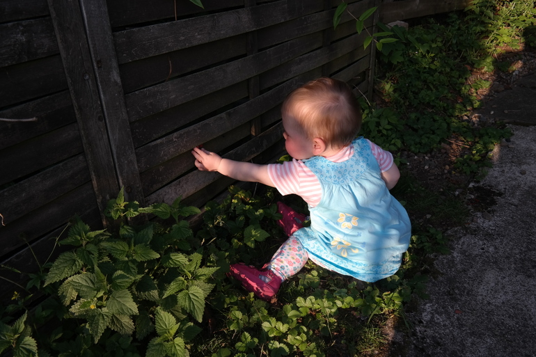 Дача, девчонка кушает соседскую землянику.