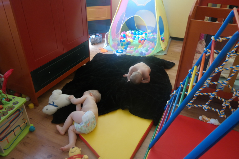 На фото - один из дней, когда мама решила, что между завтраком и обедом детей класть спать уже не обязательно. Детям год и три с половиной месяца.