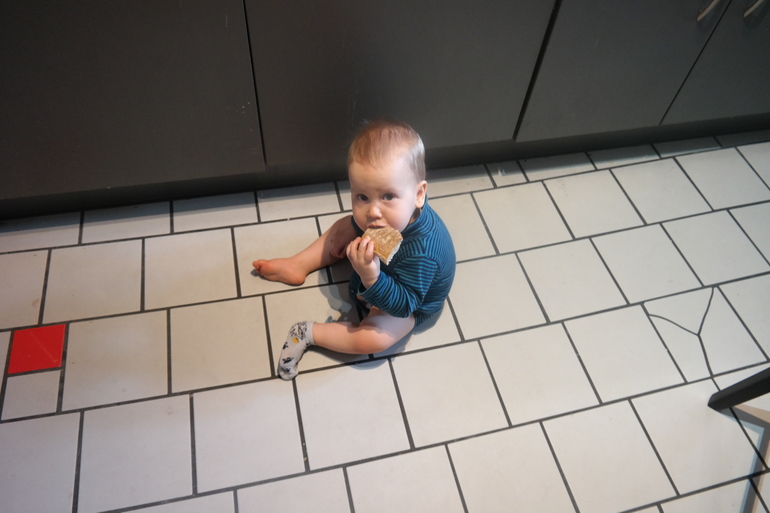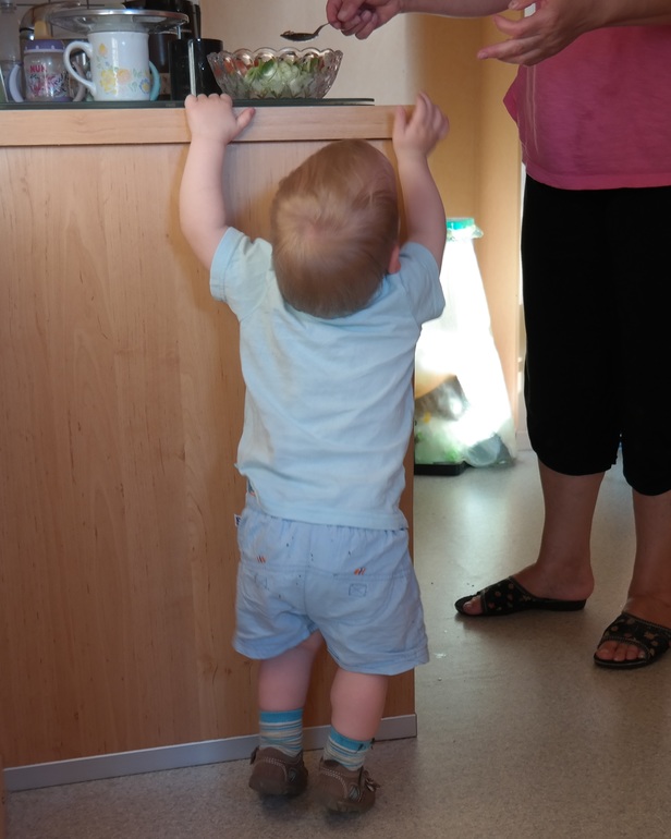 Фото ребенка в год и четыре месяца "на перекусе" (чем бог послал, то есть что сумел стащить со стола).