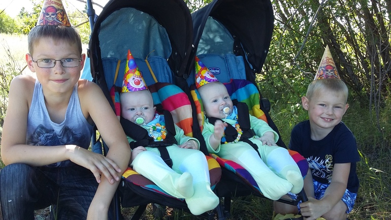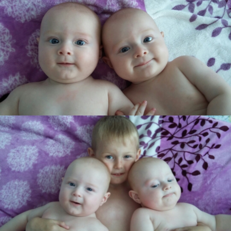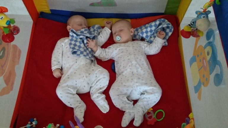 Мальчики мои лентяи, из достижений у нас только вес!😂точно не знаю, но где то 9 кг, рост 70. Что ещё умеем: лежим только на животе, на руках не встают, сидеть не получается пока, ползать не собираются, зубов нет, но руки изо рта не вынимаем... Зато есть свои плюсы!!! Где положишь там возмешь😂😂😂 Последнюю неделю начали бодрствовать на улице: смотрят по сторонам, наконец то высказали недовольство люльками, пришлось заменить на прогулочные блоки. Ааа! Главное! Мы много всего едим! Картошку, морковь, кабачок, цветная капуста и брокколи не пошли, все фрукты положенные для этого возраста, каши, соки, творог, печеньку. С прошлой недели едим через 4 часа, общий обьем еды за кормление 180 гр. И ещё одна радость: спим с 21.00 до 7 утра, а иногда и дольше. Засыпаем сами, ни когда не качаем. Все также на СВ (на ночь и утром хватает обоим, днём по одному в кормление, второму смесь). Ну как то так, и фото конечно😁
