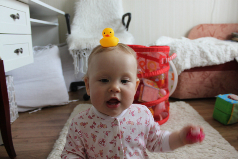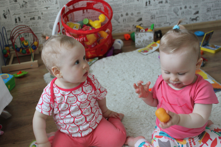 Катя говорит мама. И это воистину радость. Правда, лишь когда плачет. Любят хлопать по дивану, стенке, моим звонким ляхам. Показывают носики, ротики, ушки на родителях и игрушках. Катя складывает кольца от пирамидки в коробочку, а Варбу вытаскивает. Фавориты среди игрушек-пластмассовые мерные ложки из фикспрайса и чайные пакетики.