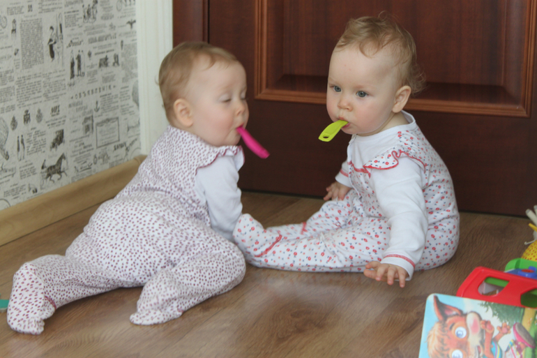 Зубы 4:2, Варя лидирует. 74 размер впритык. Вес - Катя-9530, Варя 9600. Главное умение месяца-ходить вдоль диванов. На стену опираются и целуют обои, но топать побаиваются. Стоят, держась одной рукой, во второй зажимают сокровище или тянутся/наклоняются за какой-нибудь вкуснямбой.