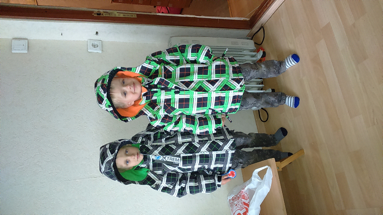 Ой, а у нас тут акция была суперская. Еще в марте я купила деткам зимнюю одежду на эту зиму. А тут в акцию, за 10 тыЩ купила на 6 лет и 7 лет. Вот и примерочка. Штаны примерять не стали, боюсь утонут вообще :)))