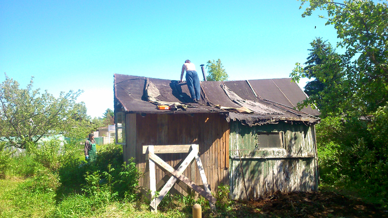 Снесли одну пристройку домика, и зашиваем, чтобы не проливало.