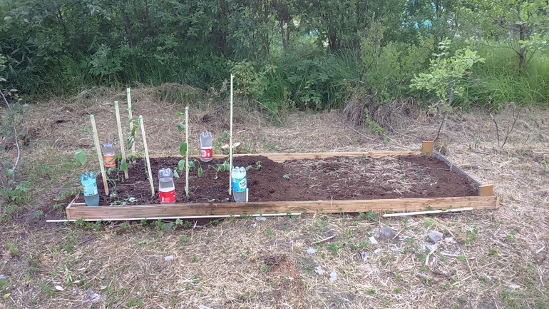 Сделали одну грядочку, посадили лучок, и мамины огурчики, а еще ей на работе дали кабачки.