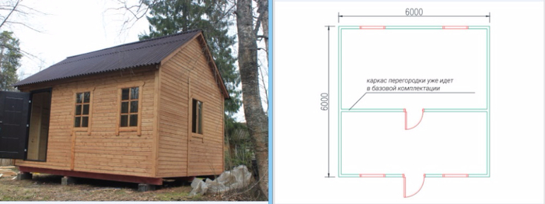 Нашли домик 6х6, просто одна комната (перегородку это они недавно на сайте обновили.) и стоимость 103000р. уже было обрадовались, поехали туда все разузнать. Оказалось что доставка + сборка, около 150 обойдется, и это черновой вариант без отделки, даже можно сказать с щелями.