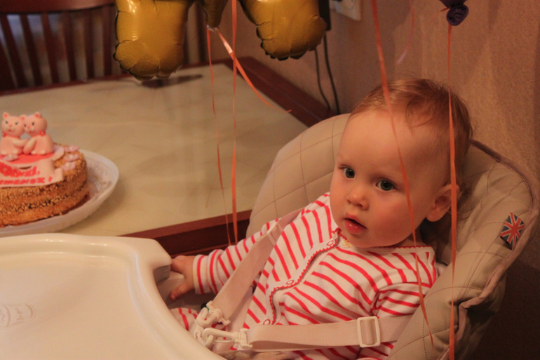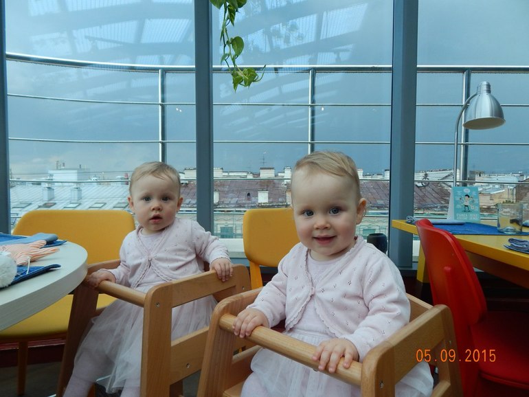 Дамы продолжили отмечать первый день рождения в ресторане со столиками на крыше, но угрожающее небо и яростные порывы ветра вынудили нас остаться внутри и не сбрасывать обглоданные кости на прохожих. На следующей неделе (как раз после манту) барышни занемогли. Захворала и я, и папа, и бабушка. К счастью, оправились быстро, но сия оказия нарушила моё намерение завершить ГВ в год. Теперь полезли зубы и я вновь откладываю. Грудь осталась перед сном, по ночам и как проснутся, притом спустя час ещё и кашу не прочь захрумать. По всей видимости, сами они от этого добра не откажутся, и тут нужны решительные меры с моей стороны. Мы спим как заключённые рядком на нарах и хуже всего приходится мне, потому что дети начали бодаться и пинаться с двух сторон. В таких ночах виновата целиком и полностью сама, не спорю, но скачки от одной кровати к другой изматывают ещё сильнее. Так что план на грядущий месяц - заменить вечернее кормление на йогурт/кефир, свернуть ГВ и научить их спать в кроватках. Посмотрим, что из этого мне удастся)