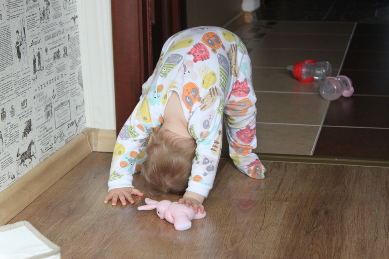Ещё пауканом очень весело ходить по квартире, из него можно встать и неуверенно постоять секунд 10, чуть что опускаясь на ладошки. Но последний трюк выделывает чаще Варбус. Катя месяц назад ещё освоила, что стоять можно без поддержки, правда, всё равно предпочитает за что-нибудь держаться.