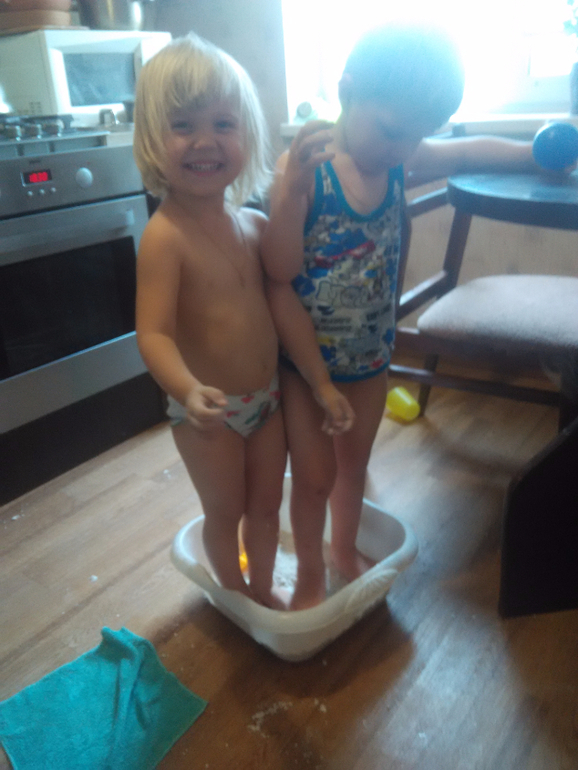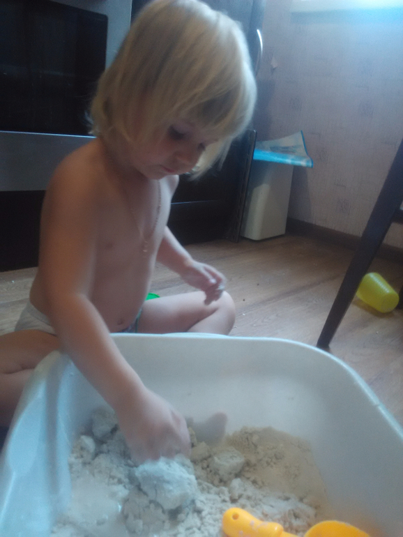 попытка сделать кинетический песок. Софья заинтересовалась.