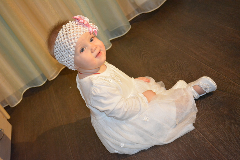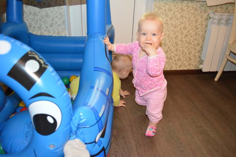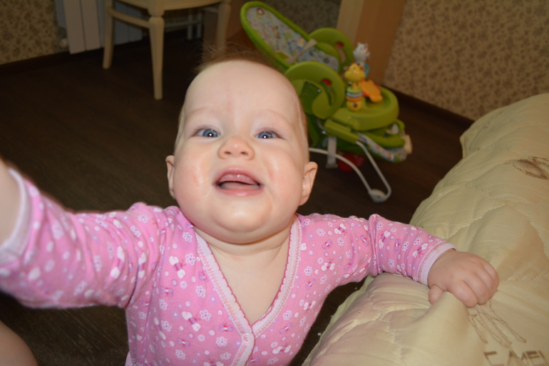 была температурка небольшая. Хорошая моя девочка, намного самостоятельнее брата - спокойно может играть сидеть без мамы, изучать все вокруг. Говорит слоги Да-да, Ма-ма, Ба-ба.