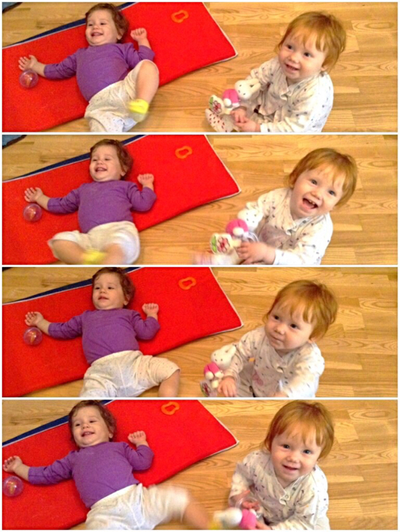 На днях делали экг - все хорошо. Алишка пытается делать первые шаги, но только на кровати. На полу просто встает на пол минутки а потом аккуратно садится. Агатка встает у опоры, но обратно садиться еще не научилась и не пытается пока. В манеже Leco сидим теперь ооочень редко, все больше на полу тусят.